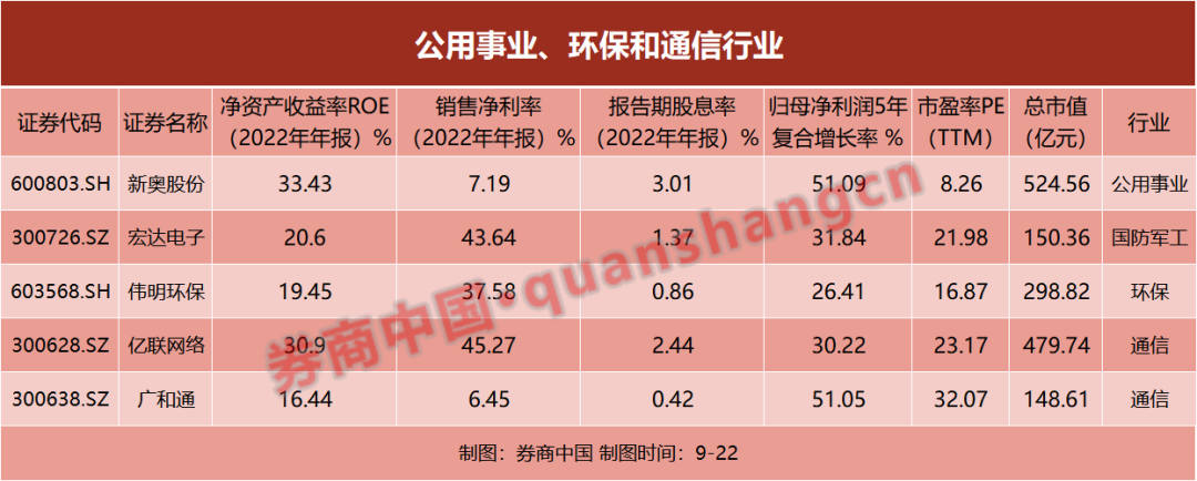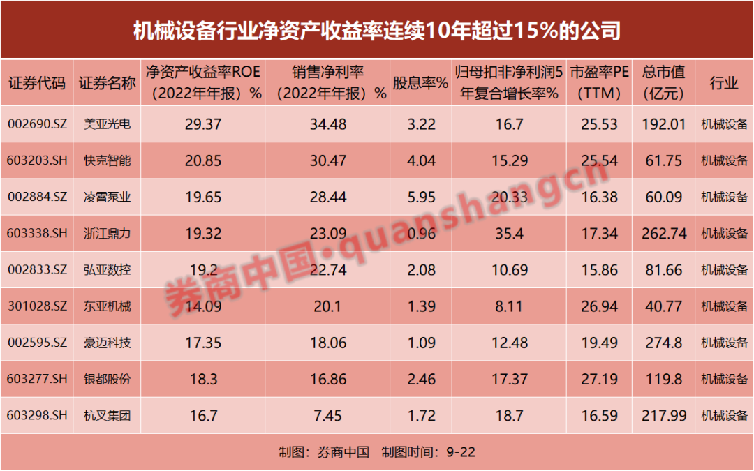 在比较冷门的机械设备行业,也有多家公司经济特征突出。比如美亚光电、快克智能、凌霄泵业和浙江鼎力等公司不仅过去十年的净资产收益率连续高于15%,而且销售净利率高达20%以上。销售净利率代表了公司在其行业的定价权,这些公司的盈利能力和盈利可持续性也值得细究。这些公司还具有相对较高的股息率和成长性。