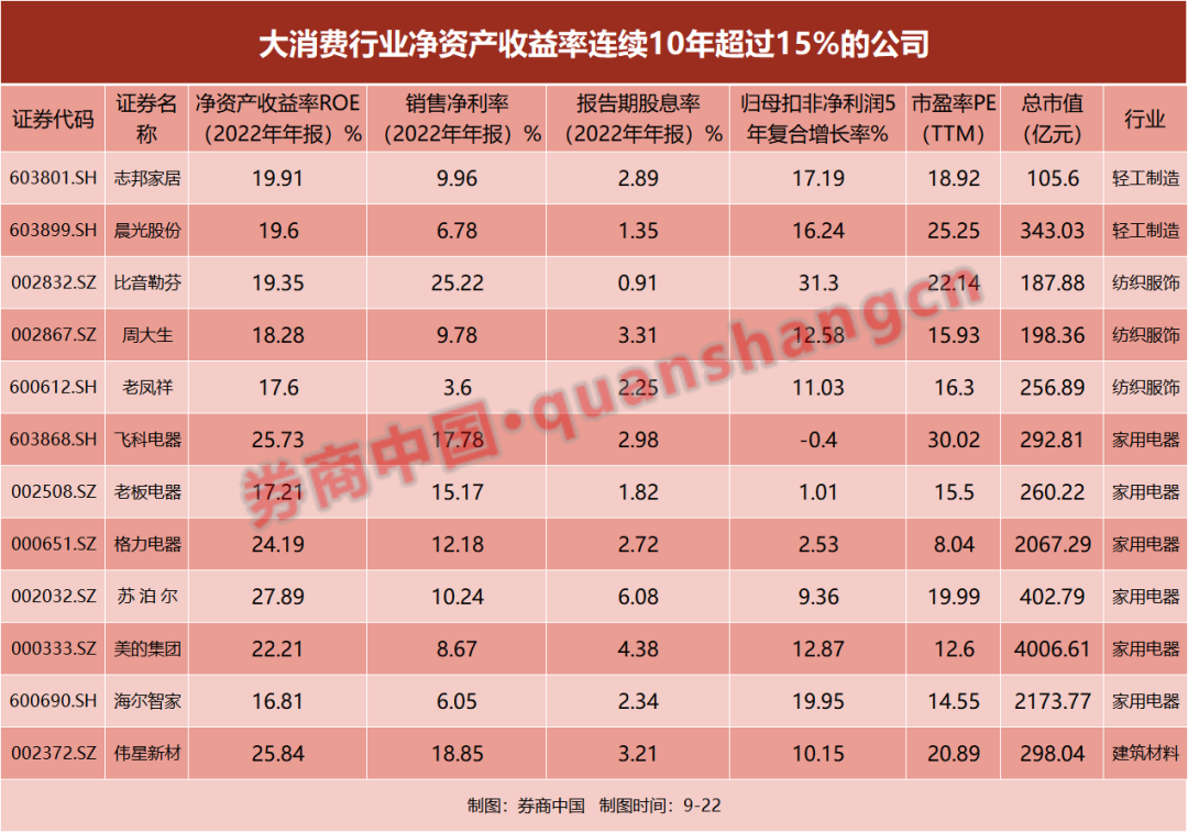除食品饮料外的其他大消费行业,也是资本回报率突出的行业。在家电行业中,苏泊尔、格力电器、美的集团、海尔智家、老板电器、飞科电器等公司的连续十年净资产收益率均高于15%,这些公司某种程度已经具有了护城河,尽管护城河相对古老的白酒行业表窄一些。这些公司还拥有比较稳定的高股息率和低估值。