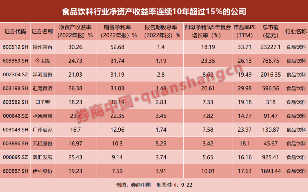 食品饮料行业属于高净资产收益率公司集中的行业,有10家上市公司的净资产收益率连续10年超过15%。贵州茅台2022年的净资产收益率更是超过30%,承德露露、迎驾贡酒、今世缘和双汇发展等公司2022年的净资产收益率超过20%。由于几乎已经没有了新进入白酒行业的尝试者,在位企业拥有极强的定价权,上述公司的销售净利率也非常抢眼,贵州茅台的销售净利率为53%,今世缘、洋河股份等公司的销售净利率为30%以上。