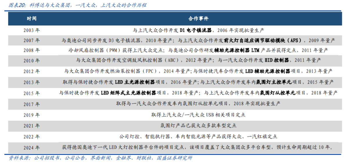 持续拓展全球核心车企,稳坐灯控龙头。深度绑定核心客户大众,迭代灯控产品,全球配套其主力车型。自2003年公司与上汽大众开展合作以来,公司逐步与大众集团和一汽大众建立了合作关系,至今保持着20余年的紧密、深入的合作,产品范围日益广泛,建立了深厚的信任基础。公司已成功融入大众集团的全球配套体系,为大众集团、一汽大众和上汽大众提供的产品包括HID主光源控制器、LED主光源控制器、辅助光源控制器、氛围灯控制器、空调鼓风机控制器、燃油泵控制器、DC/AC逆变器等多种产品,涉及大众、奥迪、保时捷、宾利、斯柯达等多个品牌的主力销售车型。整车开发周期和生命周期长,公司和客户绑定紧密。