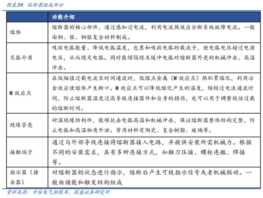 熔断器:一种依靠熔体熔化切断电路的保护电器:主要由熔体、灭弧介质、M效应点、绝缘管壳、接触端子和指示器组成。熔体是熔断器的核心组成部分,常为丝状、片状和栅状,熔体相当于串联在电路中的一段特殊的导线。熔断器串联在电路中,当电路中的电流超过熔断器的额定电流时,熔体会因过热而熔化并且断口会产生电弧,从而切断电路,起到保护电路和设备的作用。