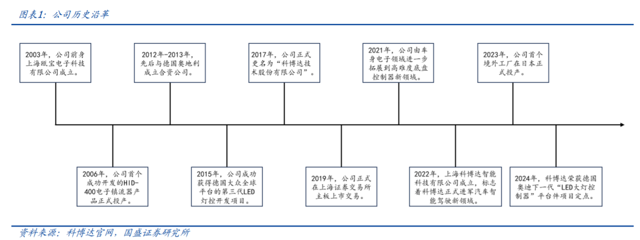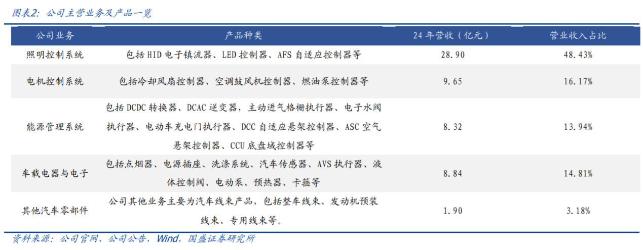 深耕汽车电子领域,全球灯控龙头,逐步扩展其他业务。公司2003年成立,专注汽车电子产品研发,目前形成LED照明控制、电机控制、能源管理、车载电器与电子四大业务板块,拥有各类光源控制器、氛围灯、中小电机控制系统、USB、底盘控制、车身域控制器、调光天幕控制器等产品。通过与欧美汽车客户的产品同步开发,融入了汽车电子全球高端产业链,产品进入其全球配套体系,同时为国内的主流汽车提供产品配套与技术服务。是国内少数能与全球高端汽车品牌,进行电子产品同步研发的中国企业。跟随大众、理想等客户不断成长。