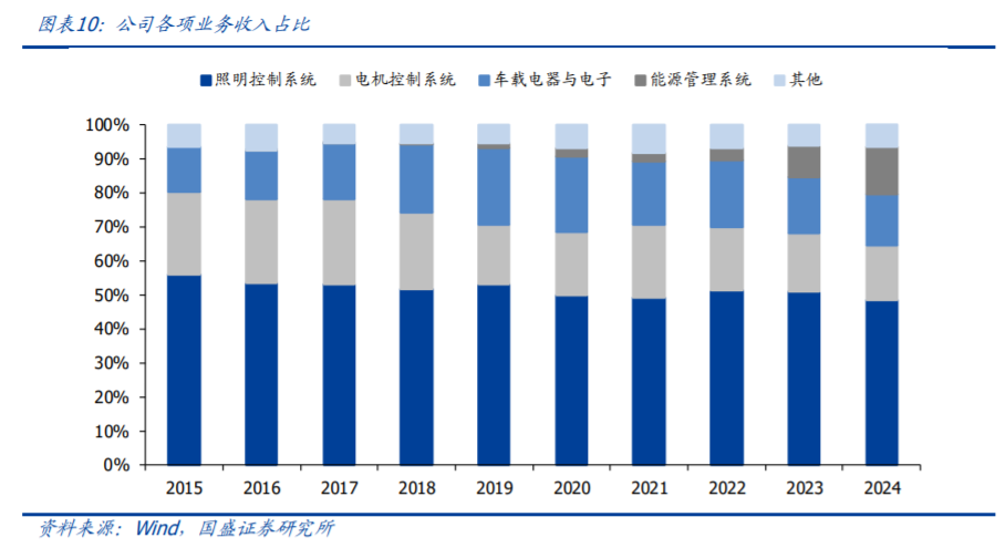 发展期(2022年至今):新老业务均进入快速增长期,不断拓宽新定点项目。2022年以后,芯片短缺问题逐渐缓解,全球汽车市场逐渐摆脱疫情等不利因素的影响,汽车产销呈现恢复性增长态势。公司原定点项目量产放量,大灯控制器、电磁阀和电机控制系统等老业务进入新的快速增长期。同时氛围灯、座舱数据电源产品、底盘控制器和智能执行器等新业务陆续量产,量产后销售表现良好,贡献业务增量,能源管理系统营收占比显著提升,2024年占比14%,较2022年提升10pct。
