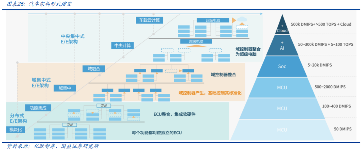 域控:汽车架构集中式发展,公司域控制器有望放量。整车电子电气架构(EEA)的演进主要分为三个阶段:分布式架构、域集中式架构和中央集中式架构。