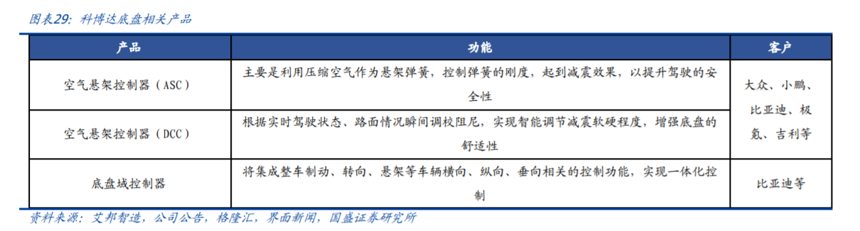 科博达底盘域产品包括底盘控制器、底盘域控制器。2021年公司由车身电子领域拓展至底盘控制器新领域,获得小鹏、理想、比亚迪等车型DCC自适应悬架控制器、ASC空气悬架控制器的定点。2022H2底盘控制相关产品逐步实现量产。后续由悬架控制器延展至底盘域控制器。