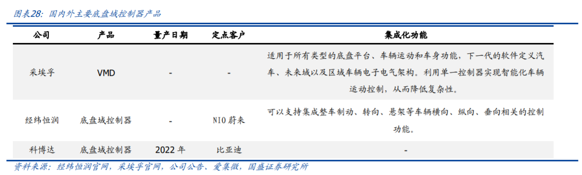 底盘域:产品拓展能力强,持续开拓车型定点。电动智能化时代,底盘域控制器需求日渐增加,国际Tier1在底盘系统的集成控制方面处于领先位置。为了配套高阶自动驾驶,底盘域控制器产品应运而生,以实现转向、制动、悬架、动力系统的集中控制和软硬件分离,以及车辆的横向、纵向、垂向的协同控制。在开放生态路线上,底盘域控制器技术壁垒较高,量产方案还不多,目前Tier1多聚焦于底盘子系统的单个/多个子系统开发(域)控制器。在底盘系统的集成控制方面,采埃孚等国际Tier1相较国内供应商更为领先。