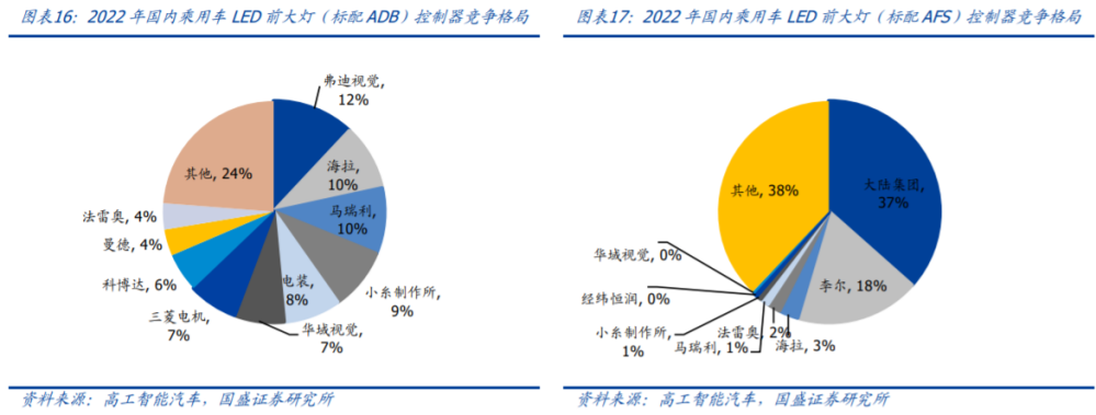 ADB、DLP渗透率低,提升空间较大。2025年1-2月,ADB/DLP大灯渗透率分别为10.7%/0.5%,较2024年提升3.7/0.1pct。目前,ADB的搭载增量仍然主要来自中高端车型,处于普及初期,随着技术发展与成本控制,后续有望向中低价位车型渗透。DLP主要应用在高端车型的高配版本中,渗透率仍较低。竞争格局来看,2022年科博达占国内ADB大灯渗透率约6%。