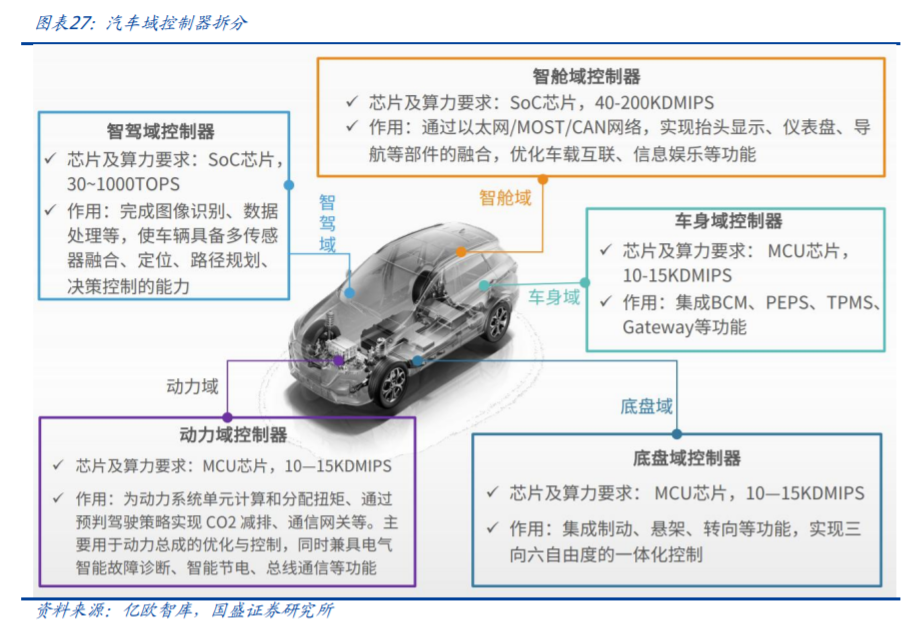 车身域:BCM向车身域控发展,公司车身域控快速上量。车身域控制器是车身控制模块BCM的进一步集成产品,在传统BCM的内/外部车灯、雨刮、车窗、车门、电子转向锁、座椅、电动尾门、后视镜等功能的基础上,和空调、热管理、EPB等模块进行进一步集成。目前来看,车身域控制器对主控芯片的算力要求不高,在目前阶段主要使用MCU芯片。未来,车身域将趋向于集成网关、低级ADAS等功能,并按照就近原则进行区域集成。