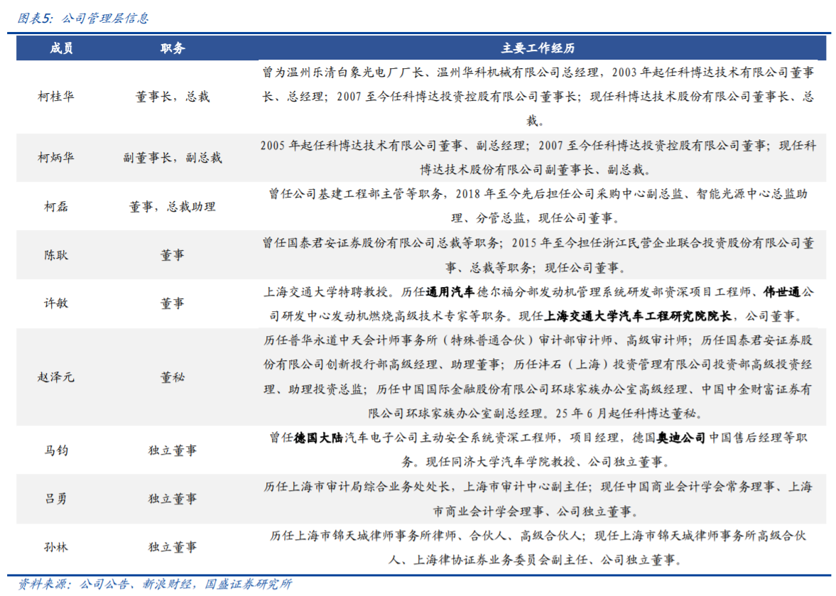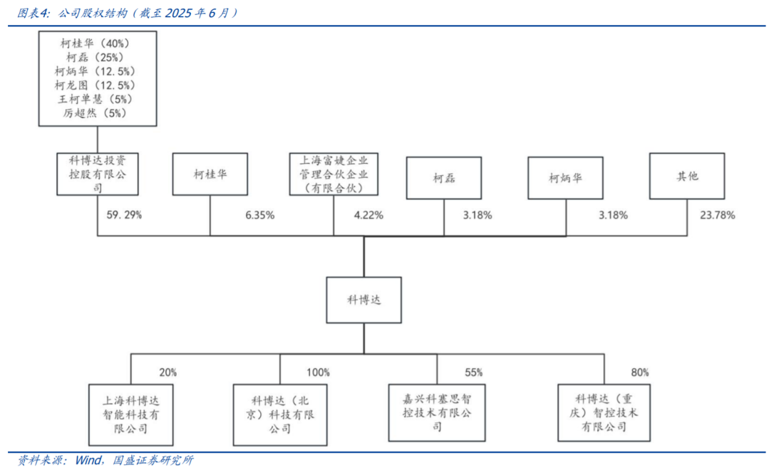 公司为家族企业,股权集中。截止2025年6月,公司前五大股东分别为科博达投资控股有限公司,柯桂华,上海富婕企业管理合伙企业(有限合伙),柯磊,柯炳华,第一大股东科博达投资控股有限公司持股达到59.29%,为实际控制人。科博达投资控股的90%股权由柯桂华,柯磊,柯炳华,柯龙图掌握。公司股东科博达投资控股有限公司,柯桂华,柯磊,柯炳华等人为一致行动人,持股比例总计72%。