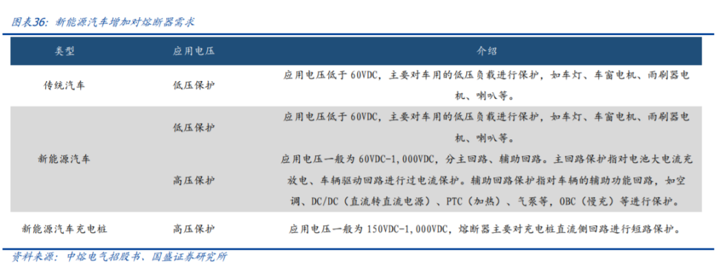 在车用熔断器方面,车用熔断器可分为低压和高压熔断器。低压熔断器主要用于对车辆低压负载进行保护,如电动座椅、车灯、车窗电机、雨刷器电机等,这类保护在传统车辆和新能源汽车上均有应用;高压熔断器主要适用于新能源汽车,应用电压一般60VDC1500VDC,主要是电力熔断器(新能源汽车高压熔断器)对主回路和辅助回路进行保护。