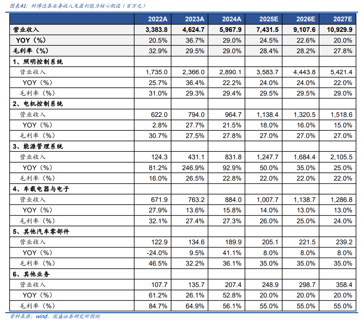 照明控制系统:受益于宝马等新定点项目贡献增量,2025-2027年营收分别同比+24%/+24%/+22%;