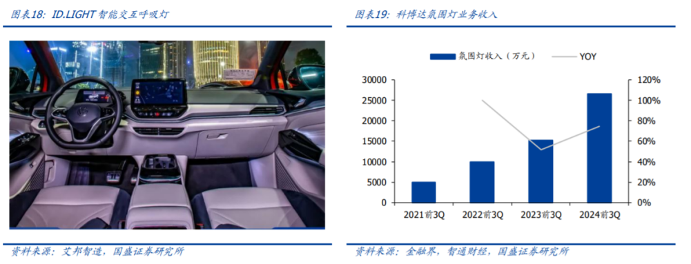 科博达产品持续升级,从HID到LED灯控,LED灯控从集成式升级至矩阵式。2005年,科博达开发出首款汽车电子产品——HID电子镇流器,成为国内首家获德国大众批准为上海大众批量配套氙气灯控制器的企业。2007年针对奥迪Q7开发出无汞HID镇流器。2014年成立专家工作站,研发LED照明控制技术,开发出LED前大灯智能控制器,相继获得大众全球LED前大灯控制器、宝马LED前大灯/尾灯控制器、福特全球LED前大灯控制器等项目的开发权,进入了汽车照明全球高端产业链。此外,科博达LED二代灯控LHC(集成式)升级至三代灯控LLP(矩阵式),可实现ADB功能。后续逐步拓展氛围灯控制器,完善产品矩阵。2024年前三季度氛围灯实现营收2.65亿,同增75%。