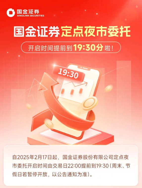 国金证券宣布自2月17日起将“定点夜市委托”开启时间从交易日22:00提前至19:30的消息,引发市场关注。