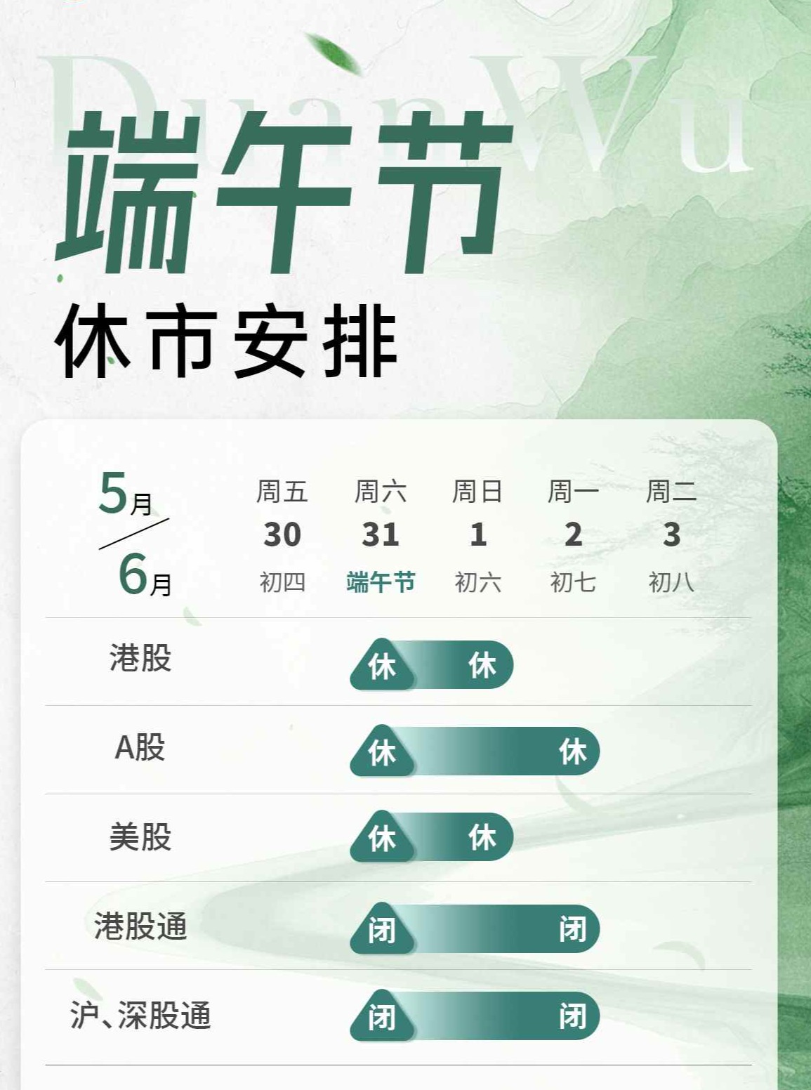 5月31日为端午节,A股市场将在5月31日(星期六)至6月2日(星期一)休市,6月3日(星期二)起照常开市。港股将在5月31日(星期六)至6月1日(星期日)休市,6月2日(星期一)恢复正常交易。