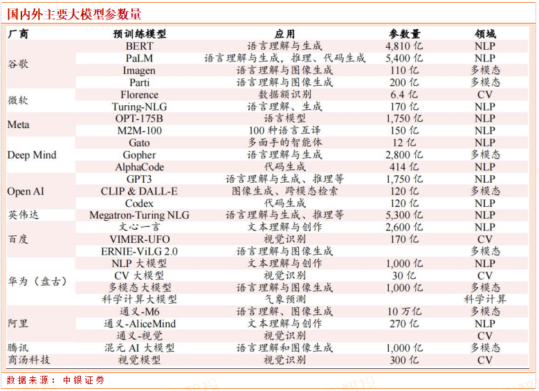 目前,海外主要大模型包括 OpenAI 的 ChatGPT-3、 Anthropic 的 Claude、英伟达与微软的 Megatron Turing-NLG 以及 Meta 的 OPT 等。中国大模型主要包括百度文心、华为盘古、阿里通义、腾讯混云以及商汤的视觉模型等。百度推出文心大模型,基本实现跨模态和多下游多领域的应用,目前已上线文心一言。华为则通过模型泛化,解决传统 AI 作坊式开放模式下不能解决的 AI 规模化和产业化难题,中国 AI 大模型正加速突破中。