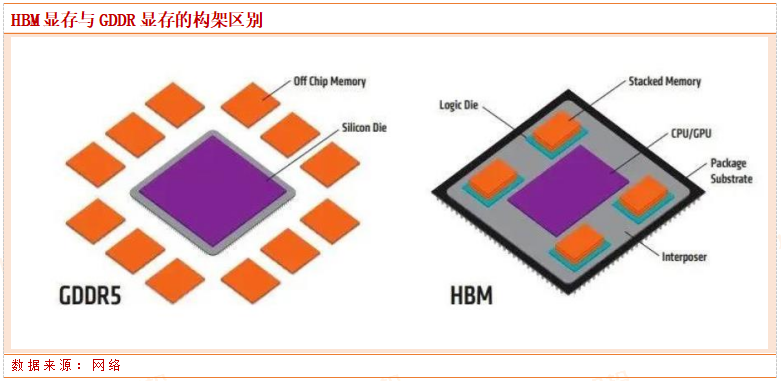 GDDR作为独立封装,在PCB上围绕在处理器的周围,而HBM则排布在硅中阶层(Silicon Interposer)上并和GPU封装在一起,面积一下子缩小了很多,举个例子,HBM2比GDDR5直接省了94%的表面积。并且,HBM离GPU更近了,这样数据传输也就更快了。