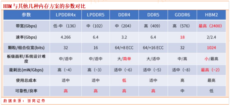 正如其名,HBM与其他DRAM最大的差别就是拥有超高的带宽。最新的HBM3的带宽最高可以达到819 GB/s,而最新的GDDR6的带宽最高只有96GB/s,CPU和硬件处理单元的常用外挂存储设备DDR4的带宽更是只有HBM的1/10。