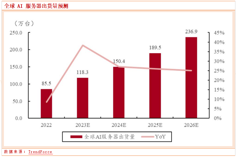 根据TrendForce,预计 2023 年 AI 服务器(包含搭载 GPU、FPGA、ASIC等)出货量近120万台,年增 38.4%,占整体服务器出货量近9%,至2026年将占15%,同步上修2022~2026年AI服务器出货量年复合成长率至22%。
