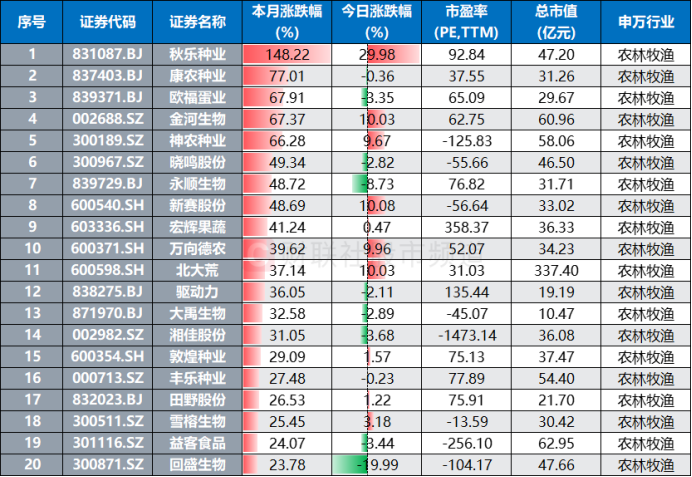 注:本月涨幅居前的农林牧渔股(截至4月9日收盘)