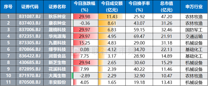 今日(4月9日),北证市场交投活跃,截至收盘,累计共有13股录得涨停。其中,人气股秋乐种业成功晋级3连板,月内涨幅扩大至148.2%,同时,其今日股价续刷历史新高,全天成交额近11.43亿元,为上市以来历史天量。