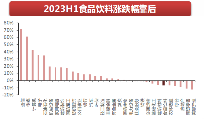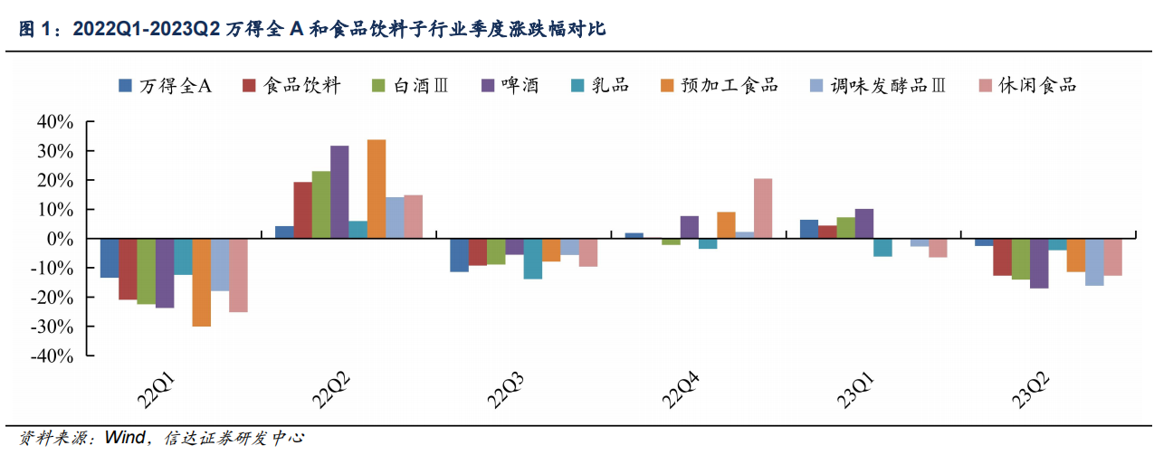 在机构对消费力较为悲观的预期下,2023Q2食品饮料跑输大盘10.1pct。