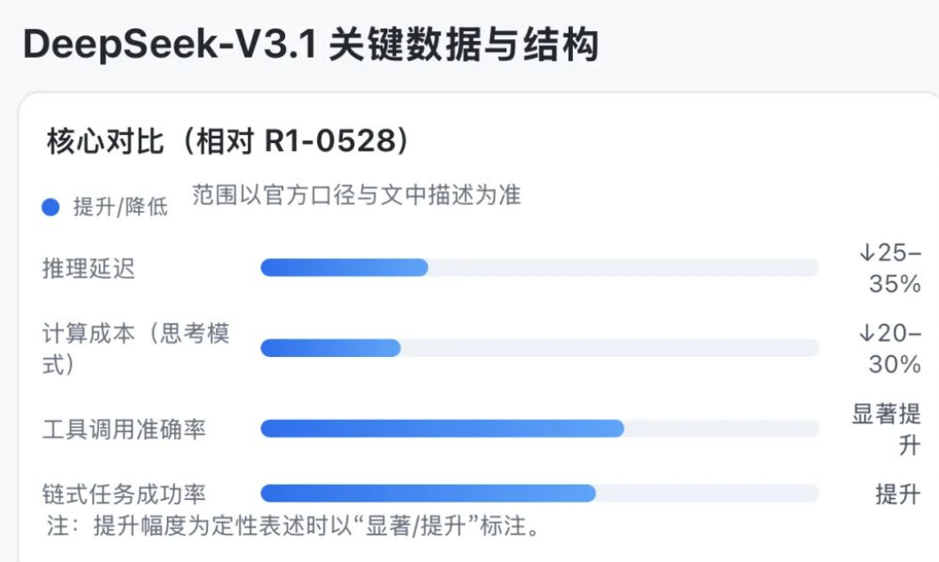 DeepSeek V3.1版本的核心亮点是采用了全新的混合推理架构,允许模型在一个统一框架内支持“思考”与“非思考”两种模式。新版本通过训练后优化,在工具使用与编程、搜索等智能体任务上表现获得较大提升。