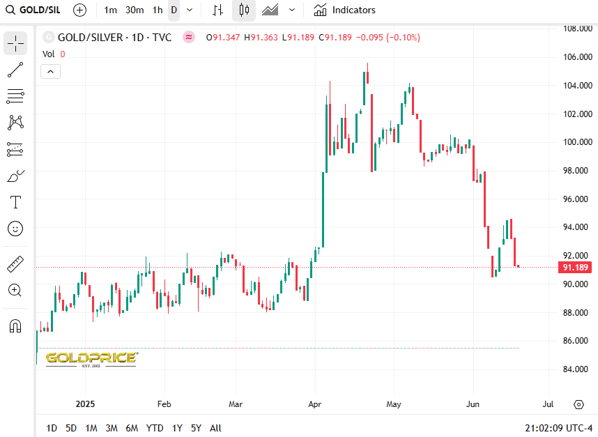 目前,金银比已经跌至91,略高于上周二的十周低点90.5,但远低于4月特朗普宣布贸易战时到达的100以上水平。理论上,当金银价格比率过高时,市场为了弥补两者之间的价差会开始抬高银价。