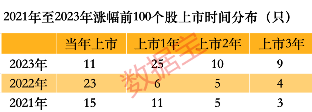 由于次新股具备风口属性,历年次新股市场表现多优于上市多年公司表现。据数据宝统计,2021年,A股涨幅前100个股中上市3年以内个股占比34%,2022年占比38%,2023年占比增加至55%。究其原因,新股上市越发集中在高科技行业,计算机、电子、医药生物、电气设备等领域上市公司居多,与彼时半导体、新能源、医药、AI等风口产业相契合。