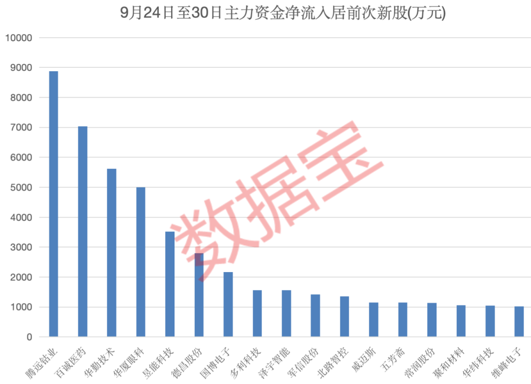 从资金面来看,近期市场对于次新股板块也十分认可。以近5日主力资金流向为基准,“次新牛”50强中,共计17股主力净流入超过1000万元。腾远钴业、百诚医药、华勤技术、华厦眼科主力资金净流入在5000万元以上,依次为8875.71万元、7032.62万元、5621.53万元、5000.35万元。