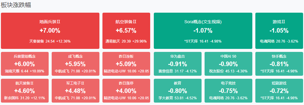 板块方面,军工、脑机接口、房地产、化学原料等板块涨幅居前,影视、游戏、英伟达概念、生物制品等板块跌幅居前。截至收盘,沪指涨0.64%,深成指涨0.19%,创业板指涨0.4%。