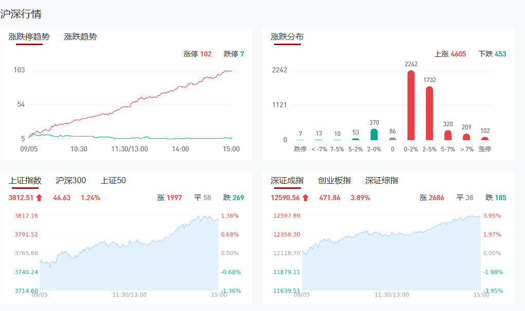 板块方面,固态电池、光伏、CPO、第三代半导体等板块涨幅居前,银行、乳业等少数板块下跌。截至收盘,沪指涨1.24%,深成指涨3.89%,创业板指涨6.55%。