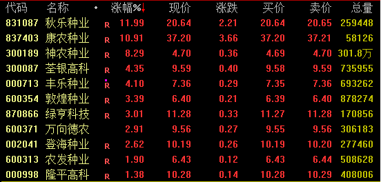 农业板块午后飙升,种业股表现亮眼,截至收盘,秋乐种业涨约12%,康农种业涨超10%,神农种业涨逾8%,荃银高科、丰乐种业涨超4%。