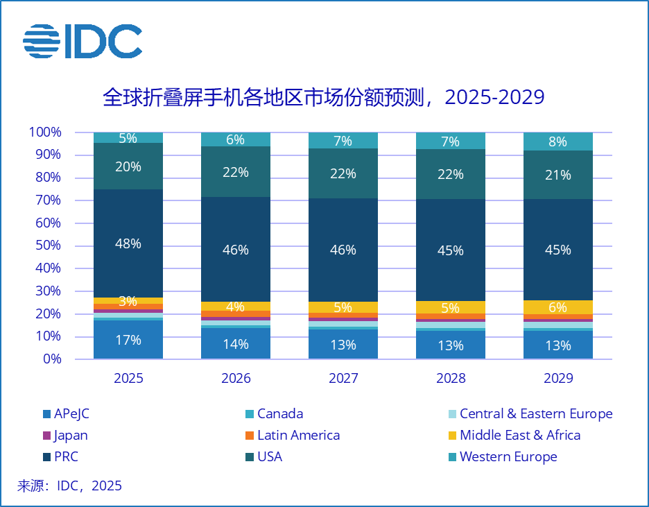 IDC表示,自2023年起,中国正式超越其他市场,成为全球最大的折叠屏手机市场。依托成熟的本土供应链体系、消费者对前沿科技的高接受度,以及厂商对用户需求的精准捕捉,中国在折叠屏手机的市场主导地位将长期稳固,该机构预计未来五年内,中国市场占全球折叠屏手机市场的比例将稳定在40%以上,持续以创新引领推动全球折叠屏技术普及与产业升级。