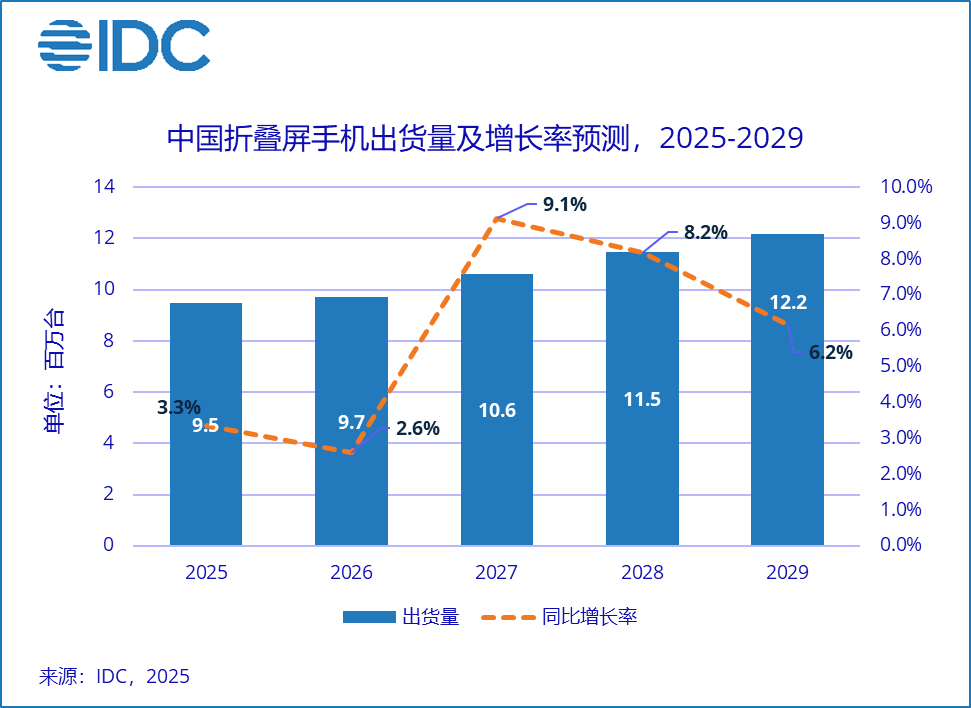 IDC最新发布的手机季度预测报告显示,预计2025年全球折叠屏手机市场出货量约1,983万台,同比增长6.0%;至2029年,全球折叠屏手机出货量预计将会接近2,729万台,五年复合增长率达到7.8%。其中,中国头部厂商持续加码这一赛道,通过在铰链、屏幕、全形态、整机轻薄、软件交互生态等核心领域的深耕,不断提升用户使用体验感,引领折叠屏行业进入 “形态创新与生态破壁”的新阶段。