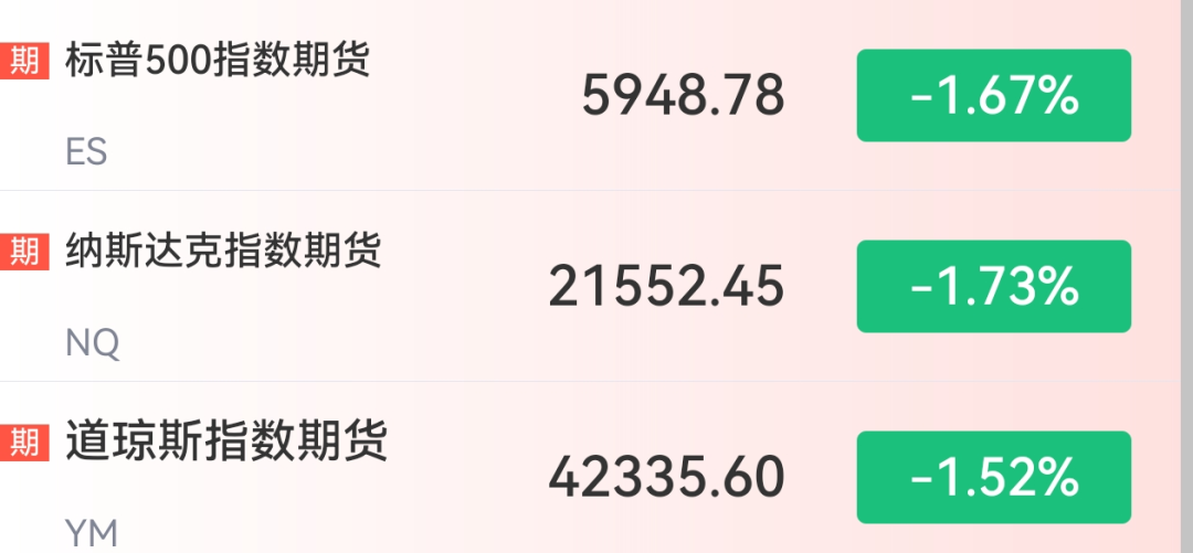 此外,美股股指期货也大幅下挫,纳指期货盘中一度跌超2%。截至发稿时,纳指期货跌1.73%,标普500指数期货跌1.67%,道指期货一度跌1.52%。