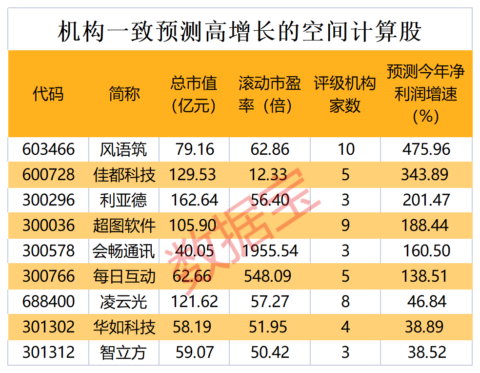 机构关注度来看,有9股的机构评级家数达到3家或以上,且机构一致预测今年全年净利润同比增幅超30%。风语筑、佳都科技、利亚德机构一致预测今年全年净利润同比增幅居前,分别为475.96%、343.89%和201.47%。