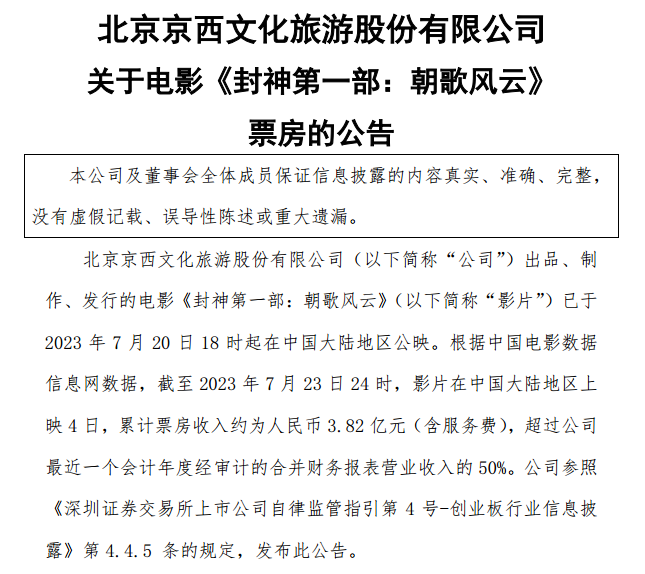 昨日晚间,北京文化公告了截至7月23日24时的票房收入,称公司出品、制作、发行的电影《封神第一部:朝歌风云》在中国大陆地区上映4日,累计票房收入约为3.82亿元(含服务费),超过公司最近一个会计年度经审计的合并财务报表营业收入的50%。截至7月23日24时,公司来源于该影片的营业收入约为2.3亿元至2.5亿元。