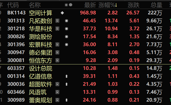 空间计算板块昨日震荡上行,收盘涨幅2.82%,凡拓数创涨超13%,华是科技涨超10%,测绘股份、宏景科技、德比集团、恒信东方跟涨。