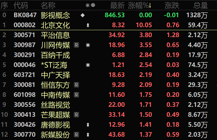 7月24日,影视传媒板块反弹,北京文化涨停,荣信文化、人民网、元隆雅图、姚记科技涨超4%。