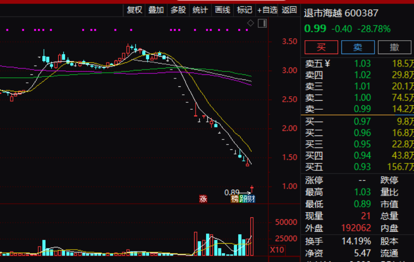 今天A股市场又有一家公司进入退市整理期,为退市海越(600387)。行情数据显示,退市海越今天上午股价重挫,盘中跌幅一度超过35%。