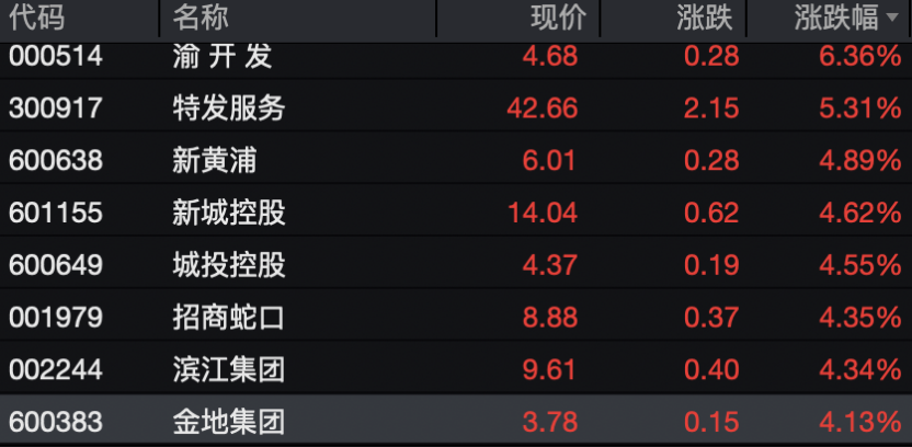 特发服务一度涨超8%,新黄浦一度涨近8%。截至午间收盘,渝开发涨超6%,特发服务涨超5%,新黄浦、新城控股、城投控股、招商蛇口等涨超4%。