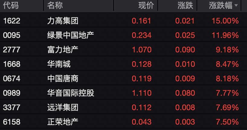 此外,截至发稿,力高集团、绿景中国地产涨超10%,富力地产、华南城等涨幅居前。