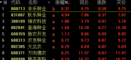 粮食概念股早盘也全线走强,其中种业板块大幅高开,一度冲高涨逾4%,创4个月来新高,半日成交超昨日全天成交。丰乐种业高开后一度触及涨停,成交量猛的增加数倍;秋乐种业则盘中大涨超10%,创历史新高;登海种业、新农开发等早间也集体异动。