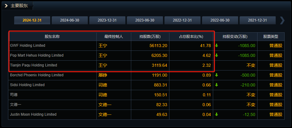 泡泡玛特2024年年报显示,王宁持有公司的股权占比为48.72%。按此计算,王宁持股市值约为1635.53亿港元(约合人民币1497.51亿元)。