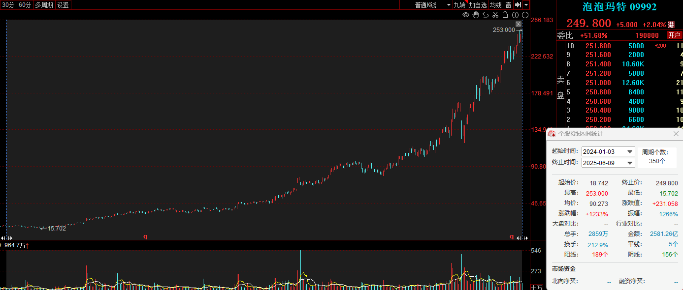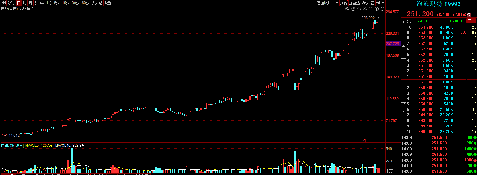 今日,泡泡玛特(09992.HK)盘中股价一度达到253港元,再度刷新历史纪录,截至发稿,其股价上涨近3%。
