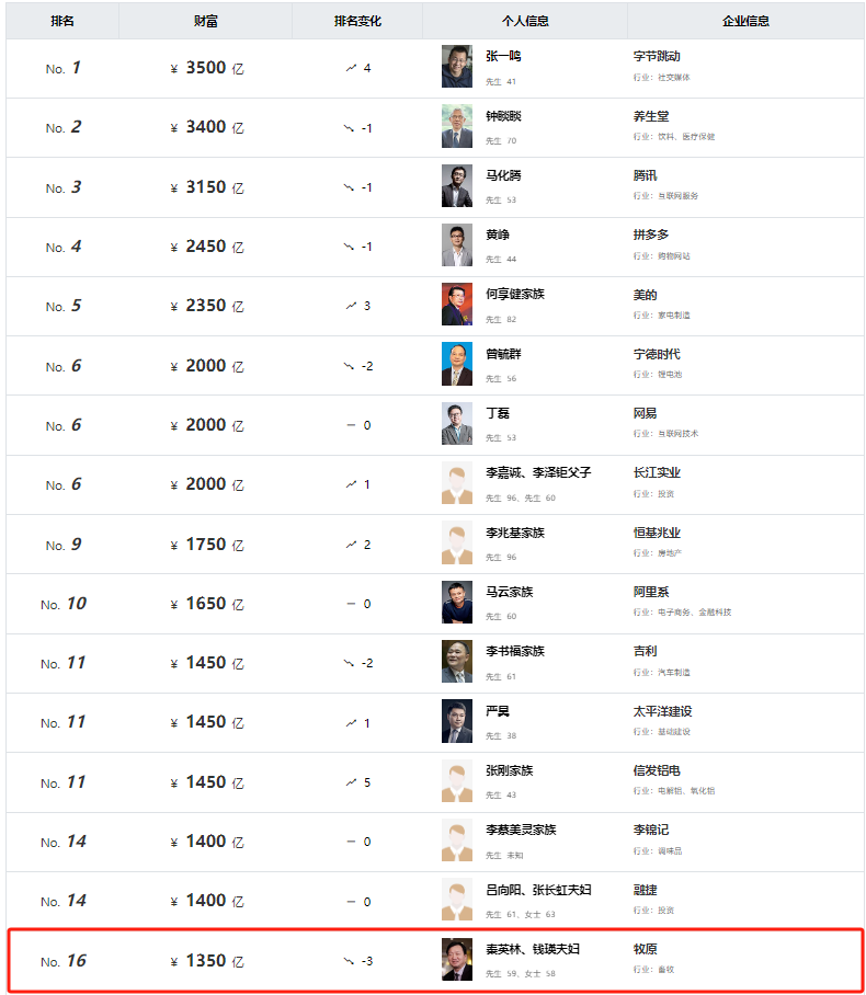 此前,河南首富的桂冠一直由牧原股份的秦英林、钱瑛夫妇蝉联。在今年3月胡润百富发布的《2025胡润百富榜》中,凭借1350亿元身家,秦英林、钱瑛夫妇不仅位列榜单第16位,也一度稳坐河南首富宝座。
