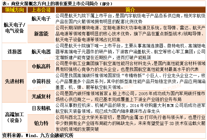 综合来看,在海外成功经验的参考之下,民营资本在航天发射服务领域的产业价值毋庸置疑、发展前景不可限量。随着我国国内民营火箭领域近期捷报佳音的集中爆发,商业火箭题材确实存在着出现异动崛起的多重基础。