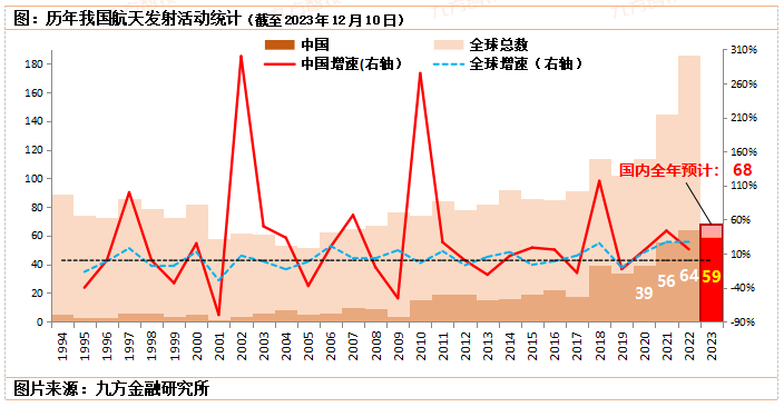 根据历年我国航天发射数据统计,我国的轨道级航天发射活动高速增长起始于十三五中期;在此期间,我国的航天发射次数年增长率基本都不低于全球总体增速水平。但是从2022年开始,由于前期数据技术的显著提升,国内航天发射活动的同比增速开始显著放缓。截至2023年12月10日,我国年内共进行了59次轨道级航天发射,距离全年计划的68次入轨发射目标已非常接近;其中,除谷神星一号发射失利以外,全年成功发射入轨载荷58次,总体发射成功率接近98.3051%,高于2022年(96.875%)与2021年(92.8571%)。