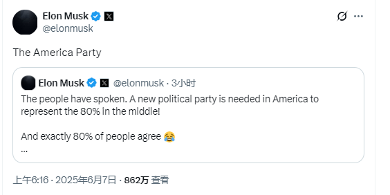 美东时间周五,美国总统特朗普和首富马斯克的骂战又有了“新剧情”——马斯克在X上声称,他计划要成立一个新的政党——“美国党(the America Party)”。
