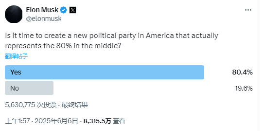 美东时间周四,在特朗普与马斯克骂战正酣之际,马斯克在社交平台X上发起了一项民意调查,询问“这个国家是否需要一个实际代表80%中间阶层利益的新政党”。而调查结果显示,超过80%的投票者都选择“是”。